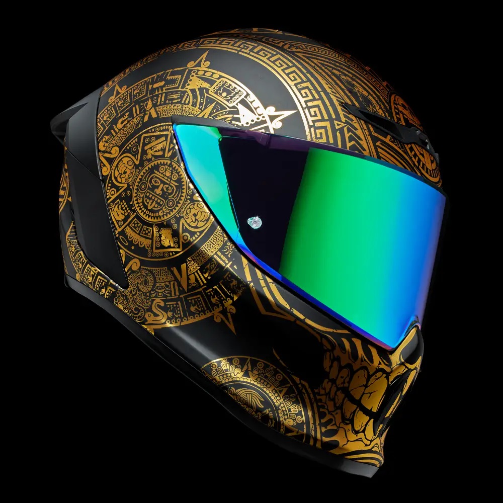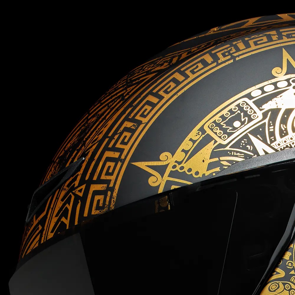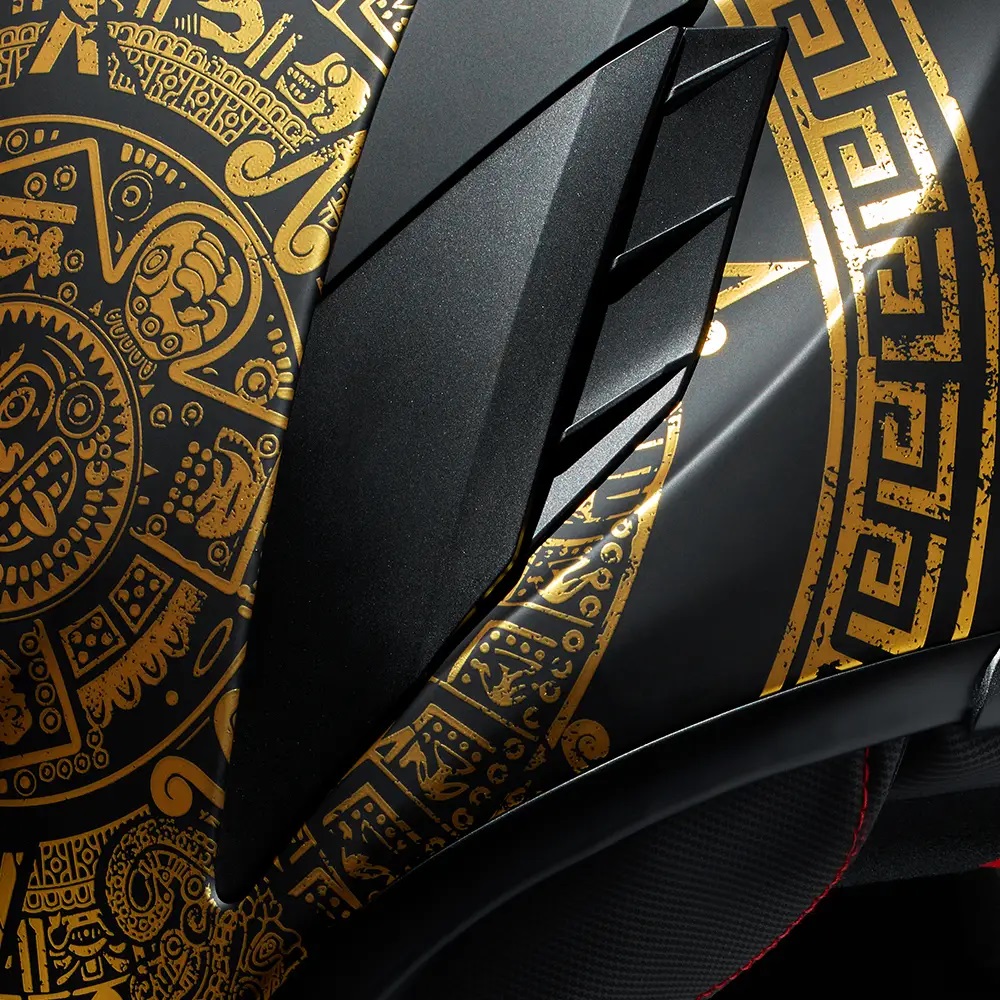 • Nici o linie Ruroc nu ar fi completă fără niște aur masivRăsărit din lumea interlopă aztecăcraniul desenat de mână al Zeului Morții Mictlantecuhtli și Pietrele Soarelui complicate, toate așezate în folie de aur, strălucesc în întunericul acestei carcase EOX negru mat.